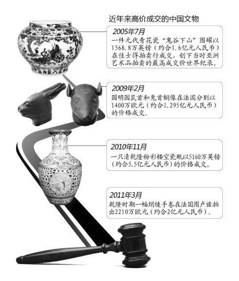 據(jù)聯(lián)合國(guó)教科文組織統(tǒng)計(jì),流失到中國(guó)境外的中國(guó)文物約164萬(wàn)件,分散在全世界47家博物館,海外民間的收藏預(yù)計(jì)是館藏的10倍。近年來(lái),中國(guó)文物成了拍賣(mài)市場(chǎng)的搶手貨,價(jià)格動(dòng)輒上千萬(wàn)。