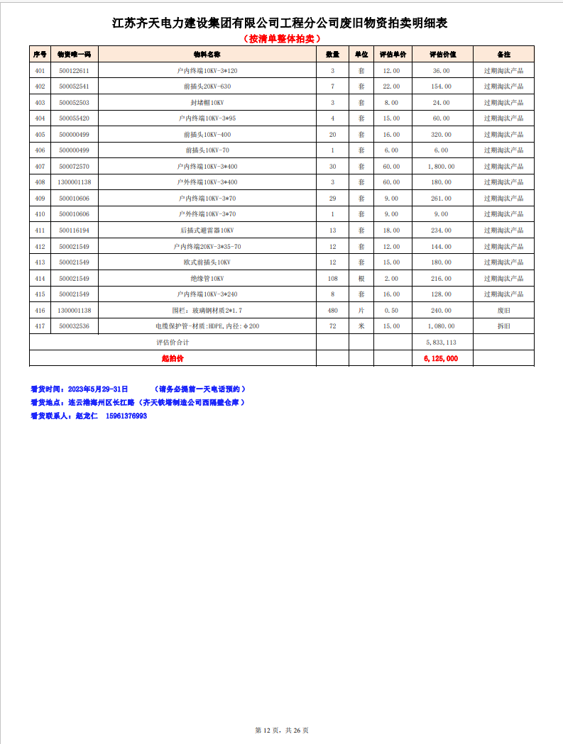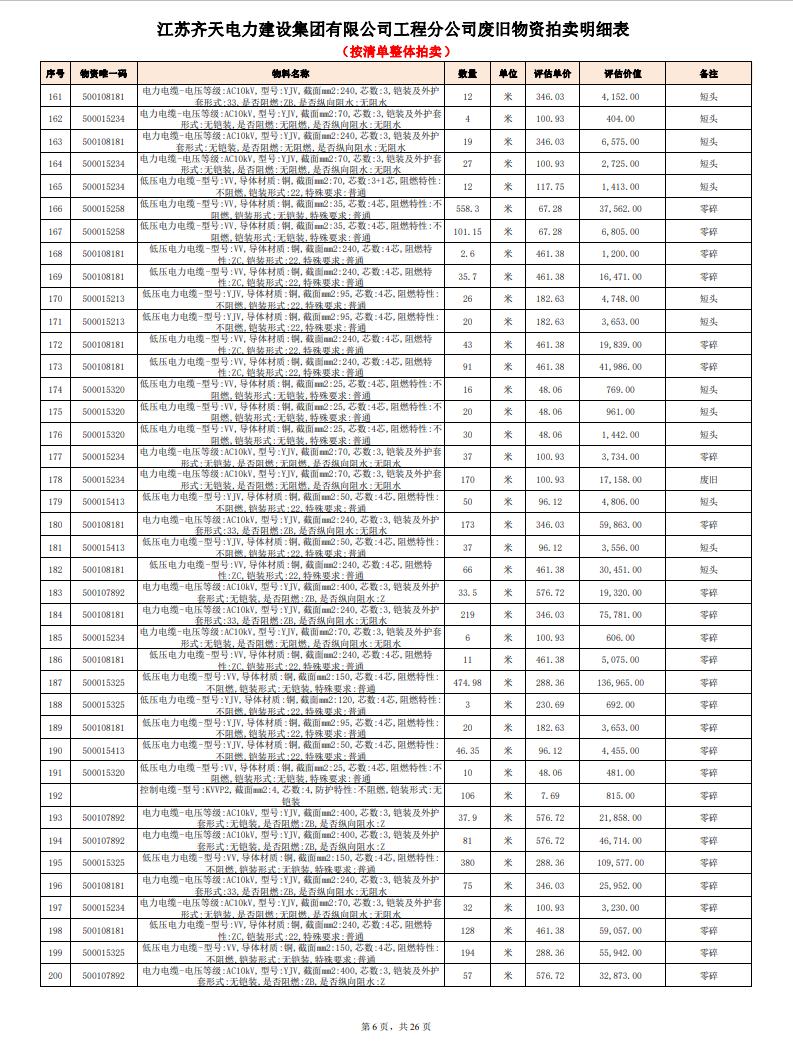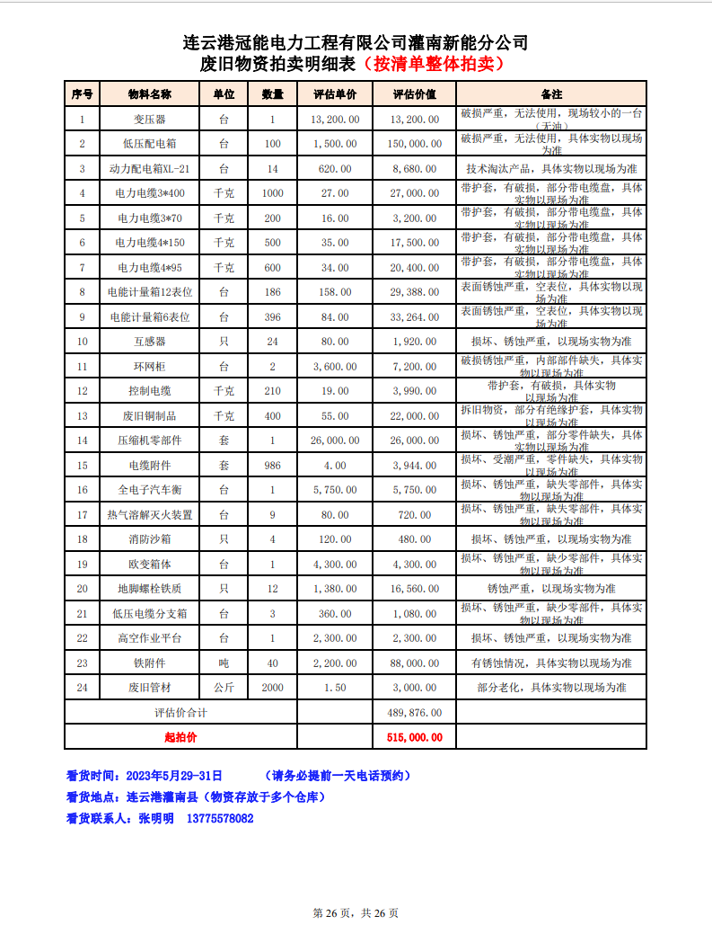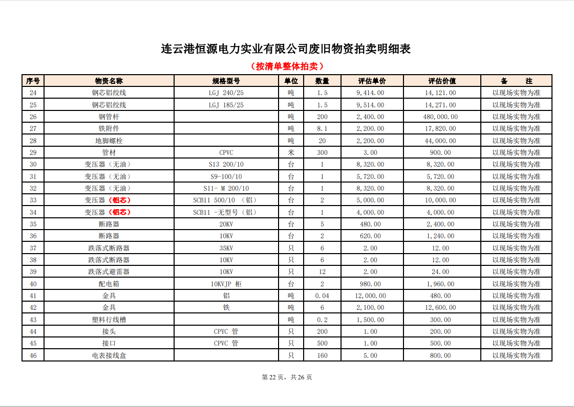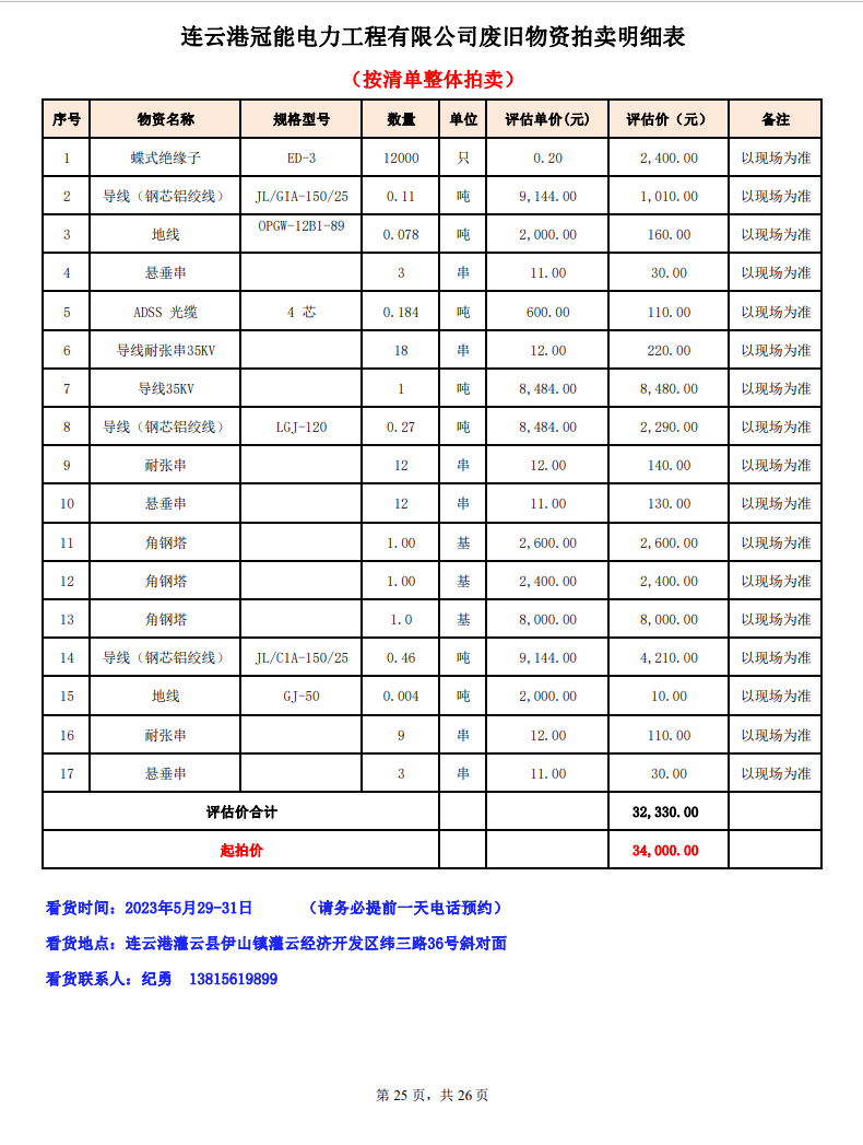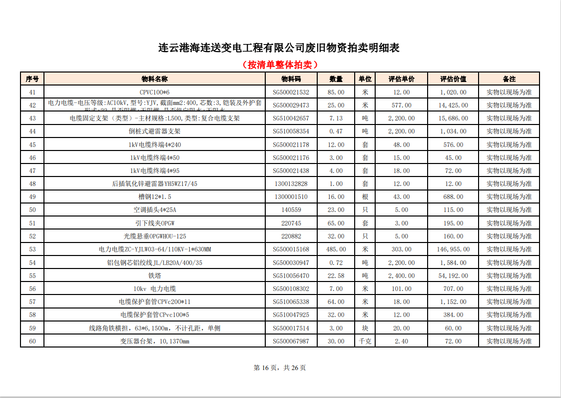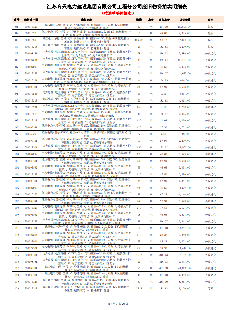 關(guān)注微信公眾號(hào)定于2023年6月1日上午9:30時(shí)(網(wǎng)絡(luò)延時(shí)除外)在中拍平臺(tái)公開(kāi)拍賣廢舊電力物資一批。主要包含:銅芯電纜、鋁芯電纜、鋼芯鋁絞線、廢舊鋼材、變壓器、電力設(shè)備、辦公設(shè)備、雜項(xiàng)物資、蓄電池等。