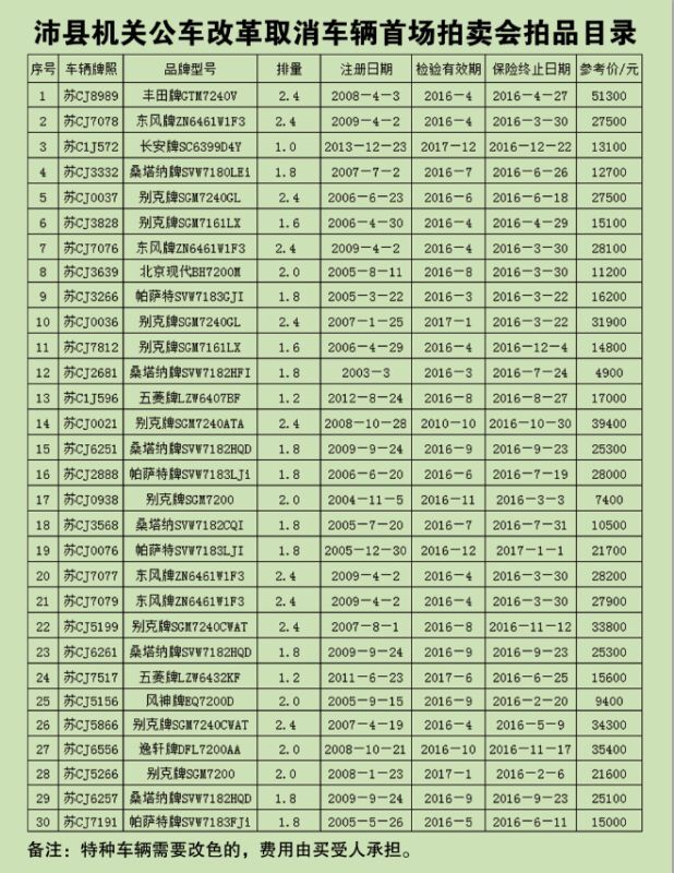 沛縣機(jī)關(guān)公車改革取消車輛拍賣會拍品目錄