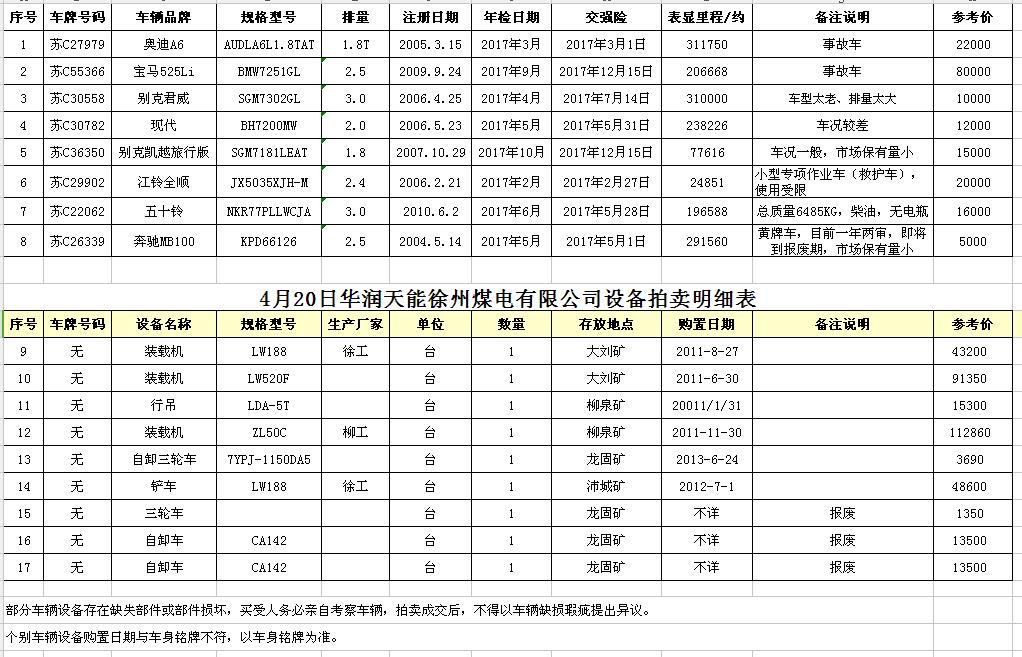 華潤天能徐州煤電有限公司車輛拍賣明細(xì)表