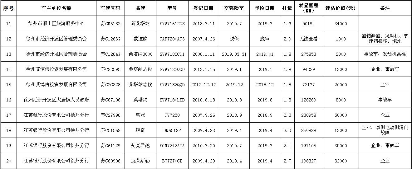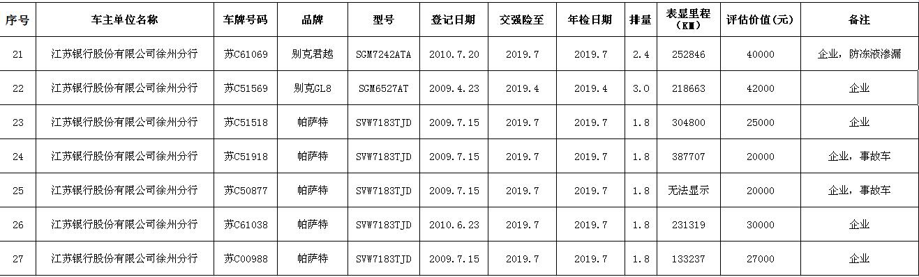 關注微信公眾號我公司受委托,定于2018年9月14日10時在中山南路55號三樓本公司拍賣廳公開拍賣:江蘇銀行股份有限公司徐州分行、徐州經(jīng)濟技術開發(fā)區(qū)、銅山區(qū)、云龍區(qū)公務車輛二十余輛。主要車型有帕薩特、皇冠、道奇、別克、克萊斯勒等。