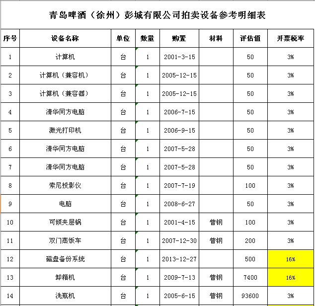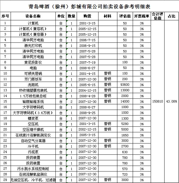 關(guān)注微信公眾號(hào)受委托,我公司定于2018年 9月28日10:00通過(guò)中國(guó)拍賣行業(yè)協(xié)會(huì)網(wǎng)絡(luò)拍賣平臺(tái)以網(wǎng)絡(luò)競(jìng)價(jià)的方式公開(kāi)拍賣:青島啤酒(徐州)彭城有限公司廢舊設(shè)備一批,主要包括:洗瓶機(jī)、灌酒壓蓋機(jī)、殺菌機(jī)、包裝機(jī)、輸瓶輸箱系統(tǒng)、辦公設(shè)備等。