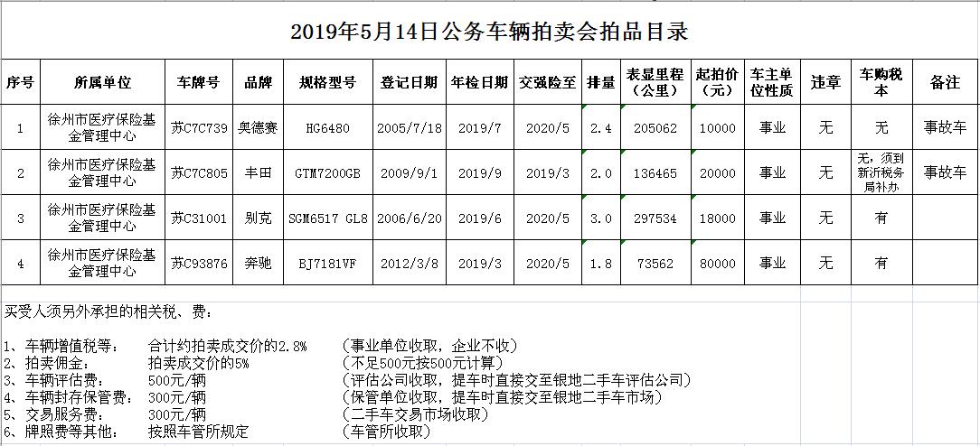 關(guān)注微信公眾號(hào)受委托,我公司定于2019年5月14日10時(shí)在徐州市中山南路55號(hào)本公司拍賣廳通過現(xiàn)場(chǎng)和中國(guó)拍賣行業(yè)協(xié)會(huì)網(wǎng)絡(luò)拍賣平臺(tái)結(jié)合拍賣的方式公開拍賣以下車輛: