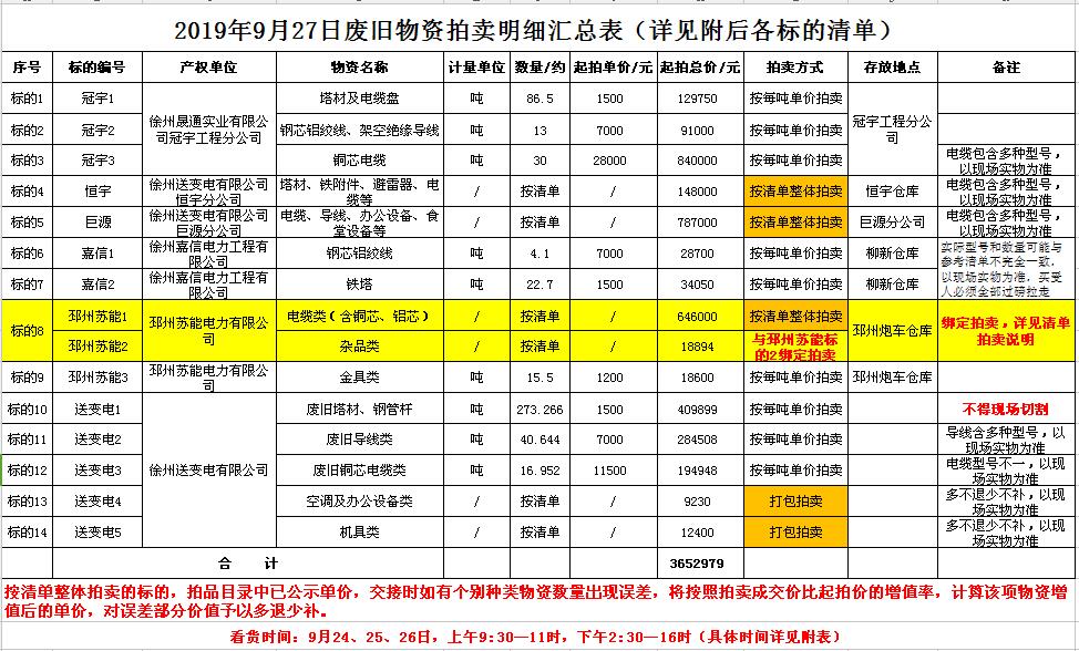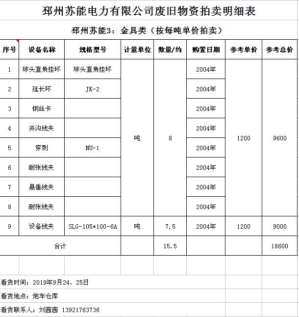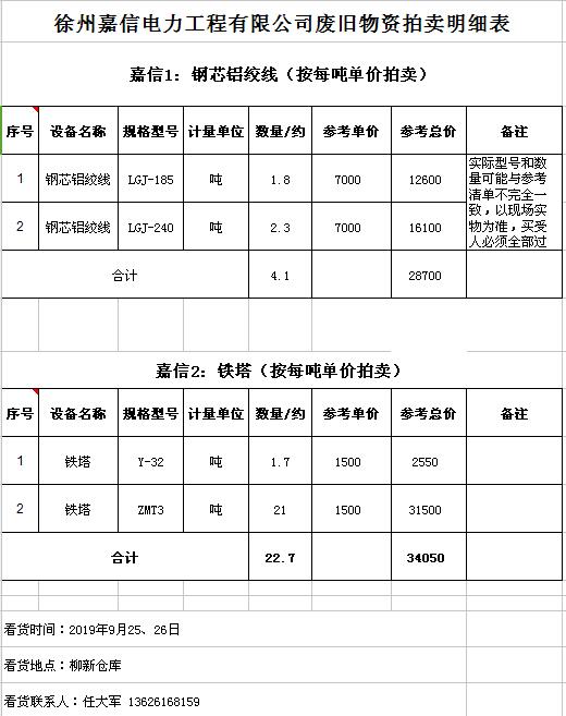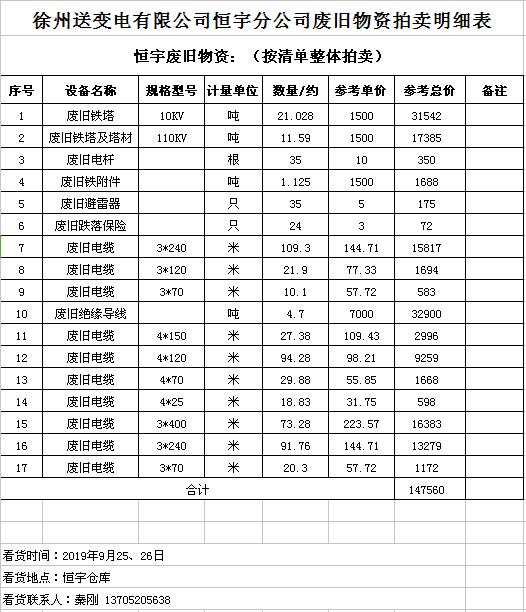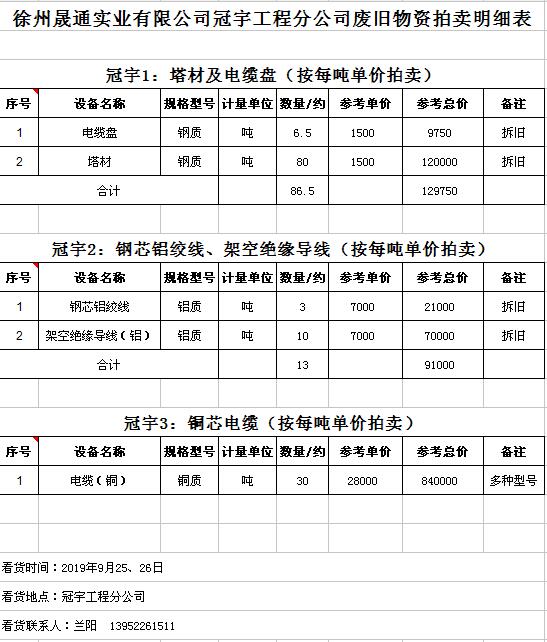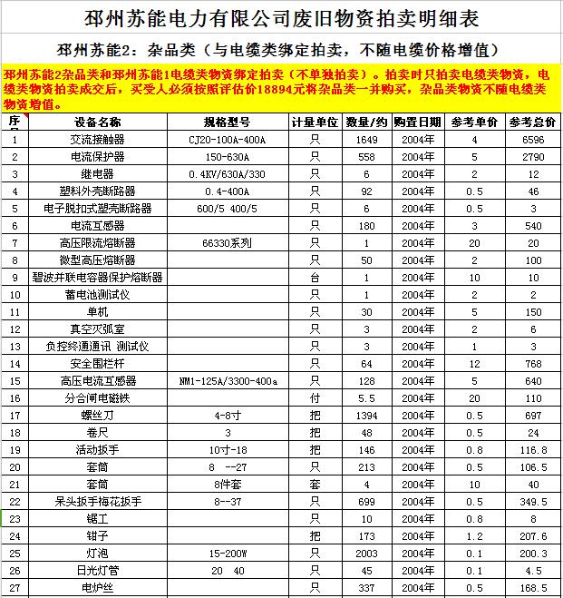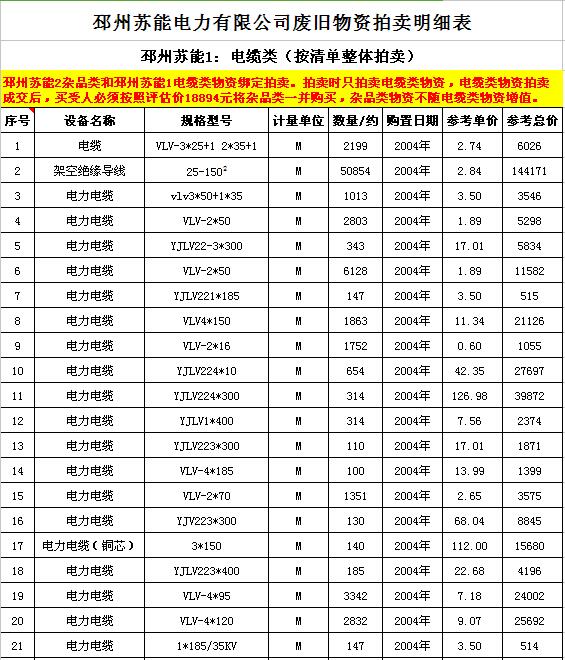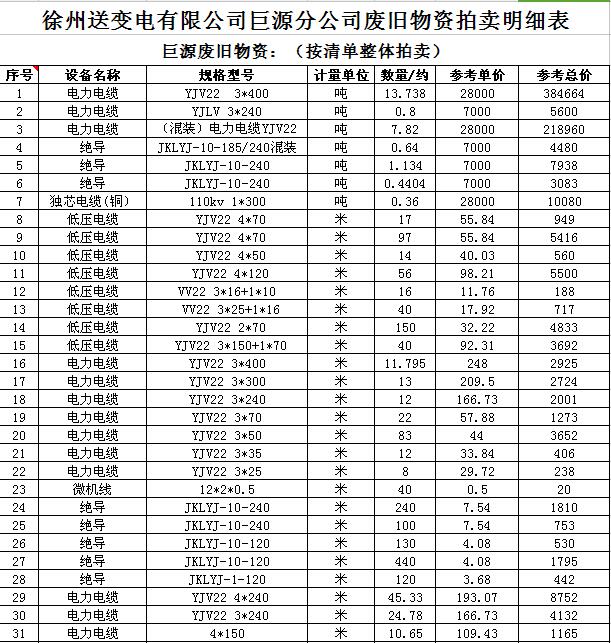 關注微信公眾號受委托,我公司將通過中國拍賣行業(yè)協會網絡拍賣平臺以網絡競價的方式公開拍賣廢舊電力物資一批,主要包括:電纜、導線、廢舊鋼材、鋼芯鋁絞線、金具、雜品、機具、空調、辦公設備等。