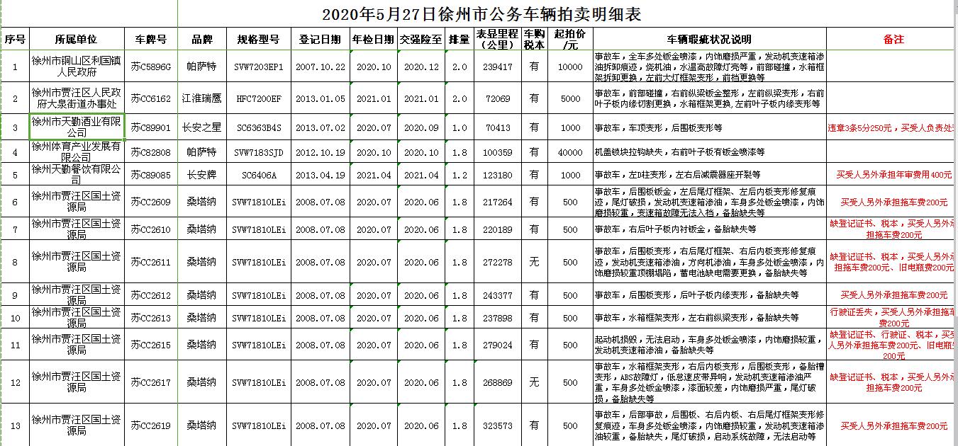 關(guān)注微信公眾號(hào)受委托,我公司定于2020年5月27日13:00時(shí)在徐州市銀地二手車交易市場(chǎng)四樓東南拍賣大廳通過(guò)現(xiàn)場(chǎng)和汽車街網(wǎng)絡(luò)拍賣平臺(tái)同步進(jìn)行的方式公開拍賣以下公務(wù)車輛: