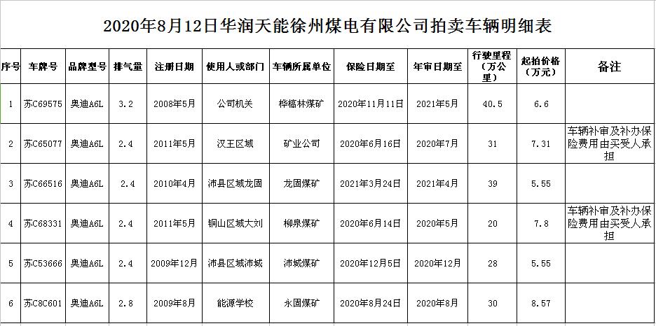關(guān)注微信公眾號受委托,我公司定于2020年8月12日14:00時通過中拍平臺和現(xiàn)場結(jié)合方式公開拍賣:華潤天能徐州煤電有限公司奧迪公務(wù)車6輛。