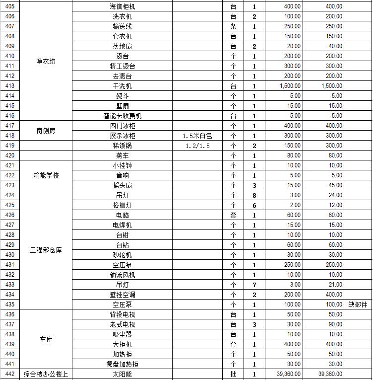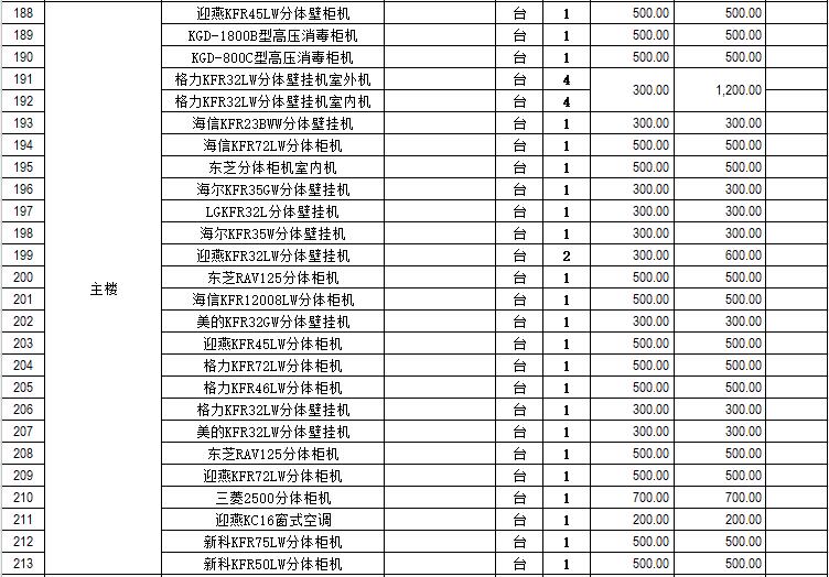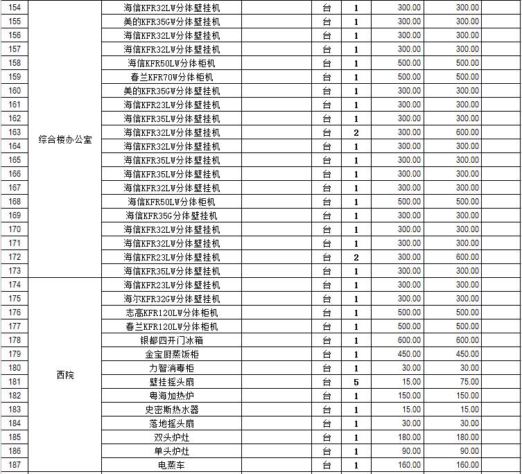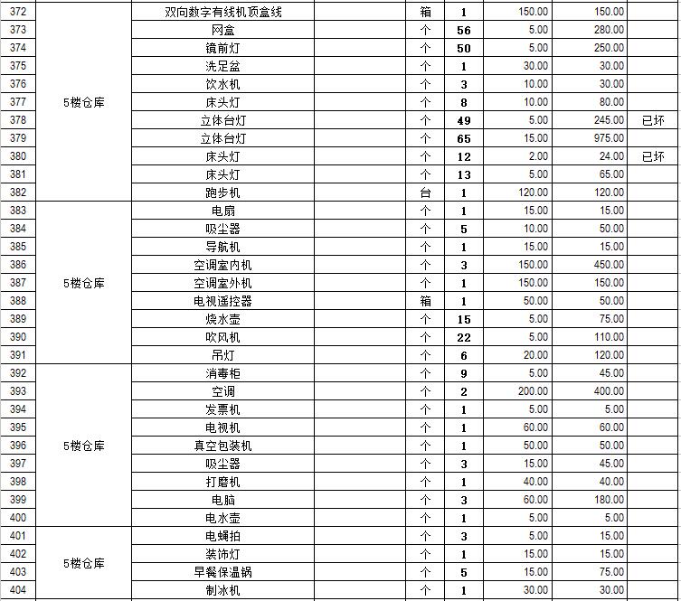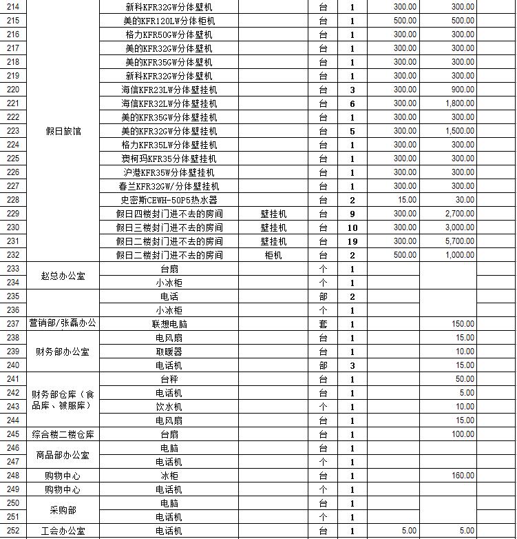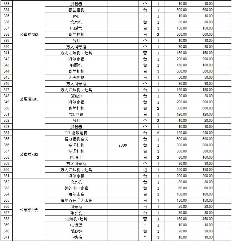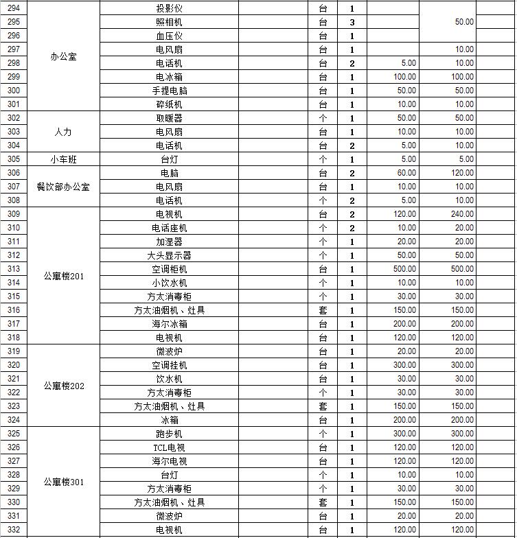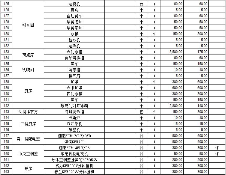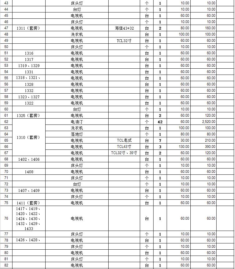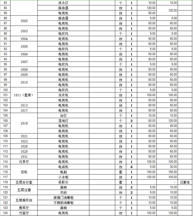 電器設(shè)備主要包含:電視機、空調(diào)、冰箱、消毒柜、電風(fēng)扇、燈具、電腦、音響設(shè)備、廚房不銹鋼灶具等。