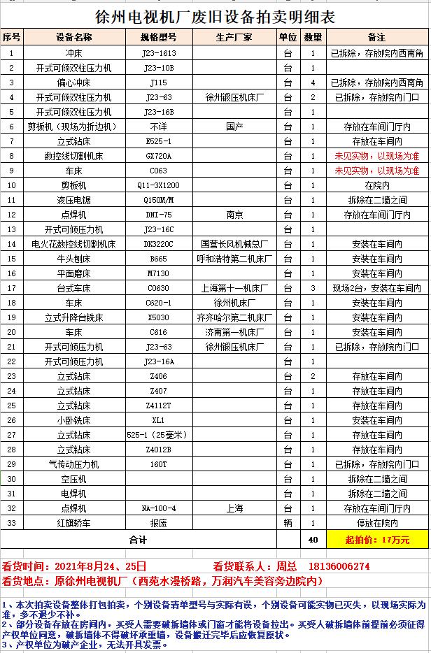 1、徐州電視機(jī)廠廢舊設(shè)備一批。包含:沖床、壓力機(jī)、折邊機(jī)、鉆床、機(jī)床、車(chē)床、刨床、磨床、銑床等、空壓機(jī)、電焊機(jī)等。(競(jìng)買(mǎi)人須為具有再生資源回收資質(zhì)的企業(yè)法人),拍賣(mài)參考價(jià)17萬(wàn)元。保證金5萬(wàn)元。