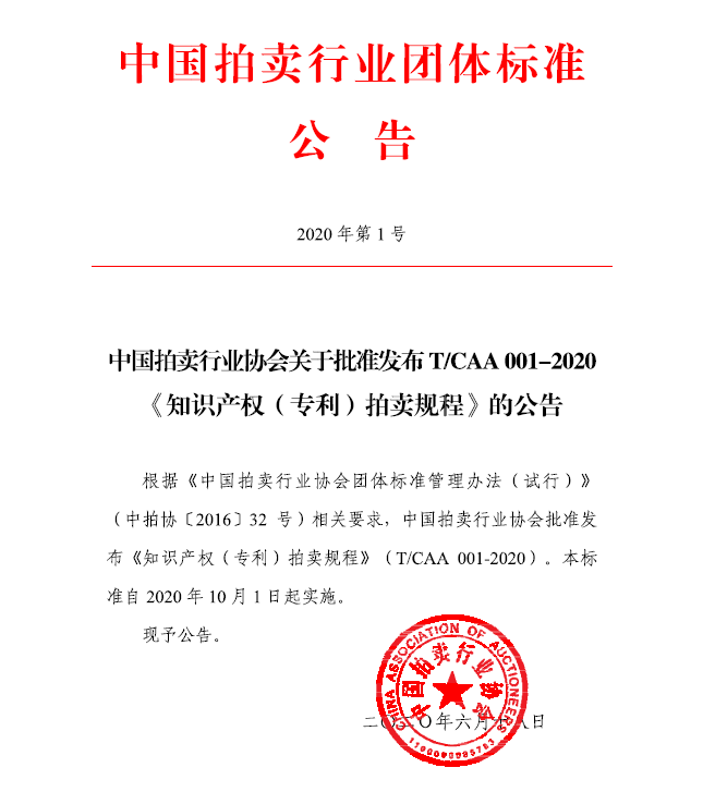 《知識(shí)產(chǎn)權(quán)(專利)拍賣規(guī)程》(T/CAA 001-2020)